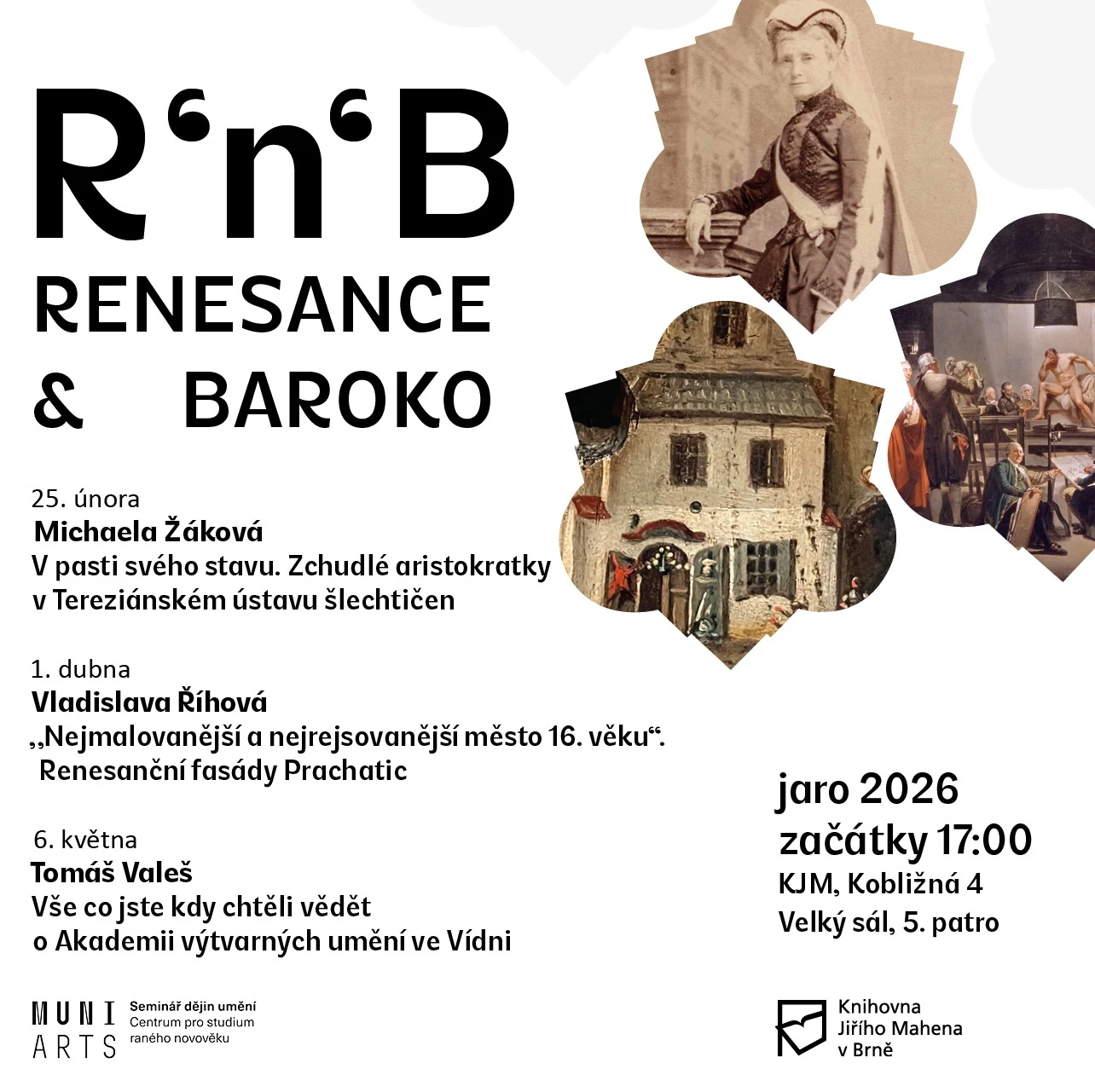 Cyklus zahájí Olga Kotková z Národní galerie, Markéta Jarošová z Karlovy univerzity (26. 11.) vám přiblíží dvě významné sběratelky raně novověkého umění a Michaela Žáková z Akademie věd ČR (17. 12.) připomene příběh aristokratek z Tereziánského ústavu šlechtičen.