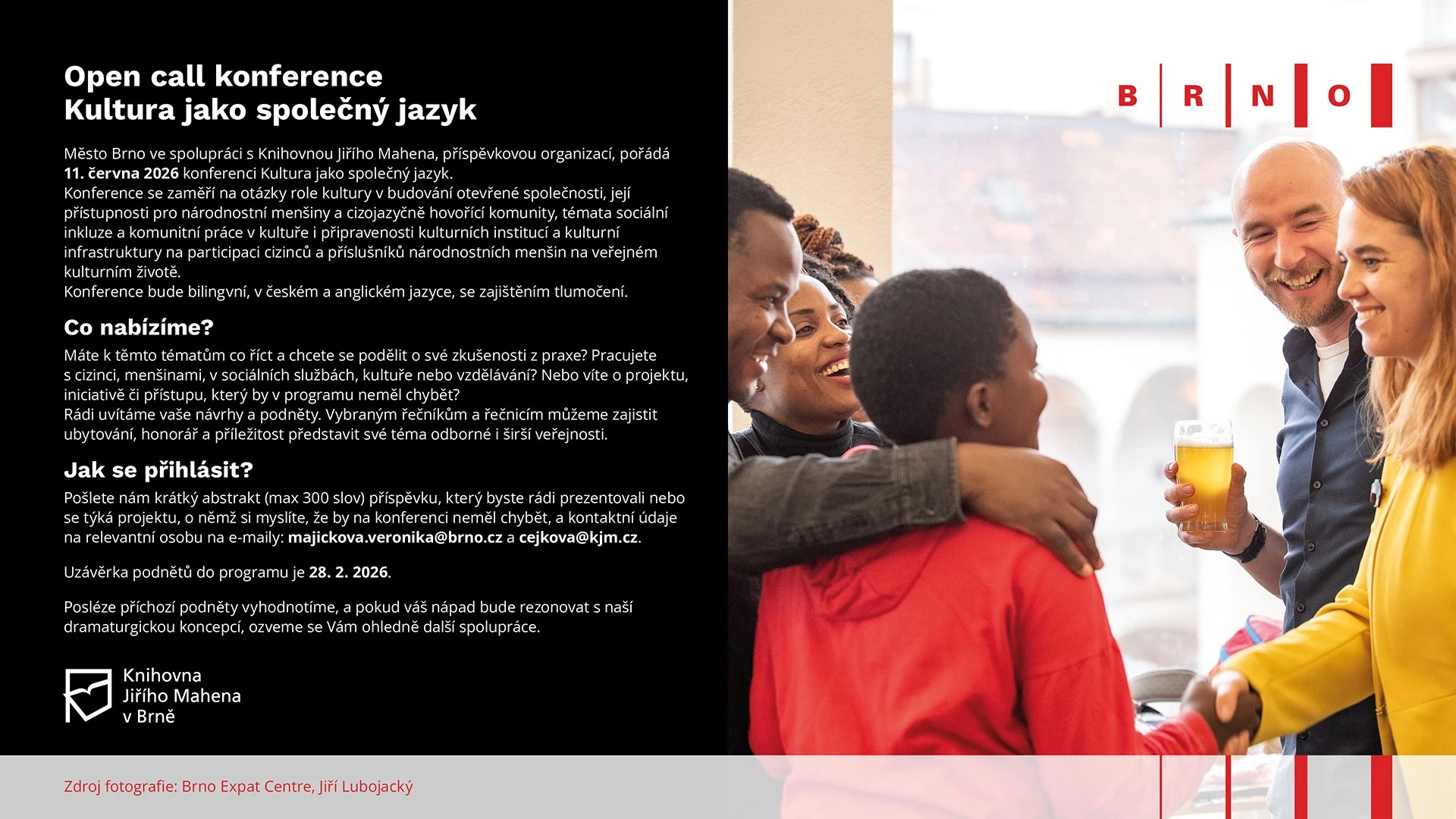 ➤ Město Brno ve spolupráci s Knihovnou Jiřího Mahena, příspěvkovou organizací, pořádá 11. června 2026 konferenci Kultura jako společný jazyk.
