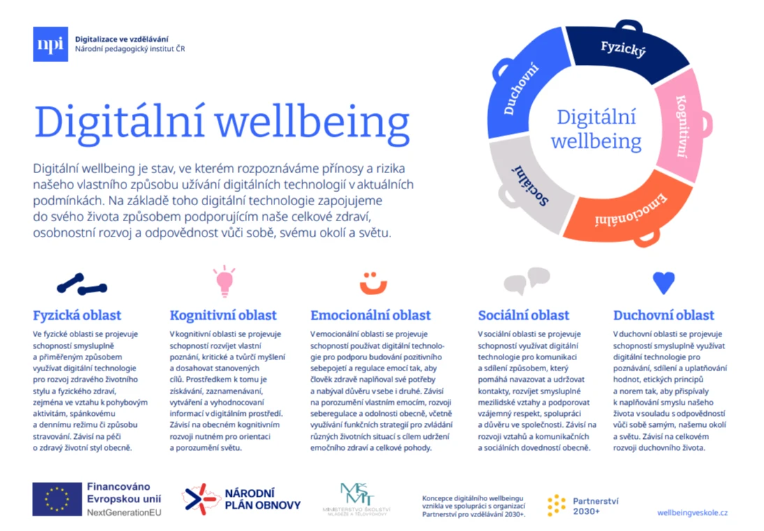 Podle Národního pedagogického institutu ČR můžeme digitální wellbeing definovat jako „stav, kdy člověk rozpoznává přínosy a rizika užívání digitálních technologií a podle toho je zapojuje do života způsobem, který podporuje jeho celkové zdraví, osobnostní rozvoj a odpovědnost vůči sobě, okolí a světu.“ Tento stav zahrnuje fyzickou, kognitivní, emocionální a sociální oblast. Jakkoli definice směřuje primárně do školního prostoru, vnímáme jako zásadní otevřít diskusi nad tím, jakou roli v jeho podpoře mohou mít knihovny.