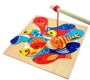 Dřevěný proutek s magnetem zavěšeným na provázku, na který se musí nachytat rybičky. Když děti přestane lov rybiček bavit, mohou se pokusit složit rybičky tak, aby do sebe správně zapadaly.