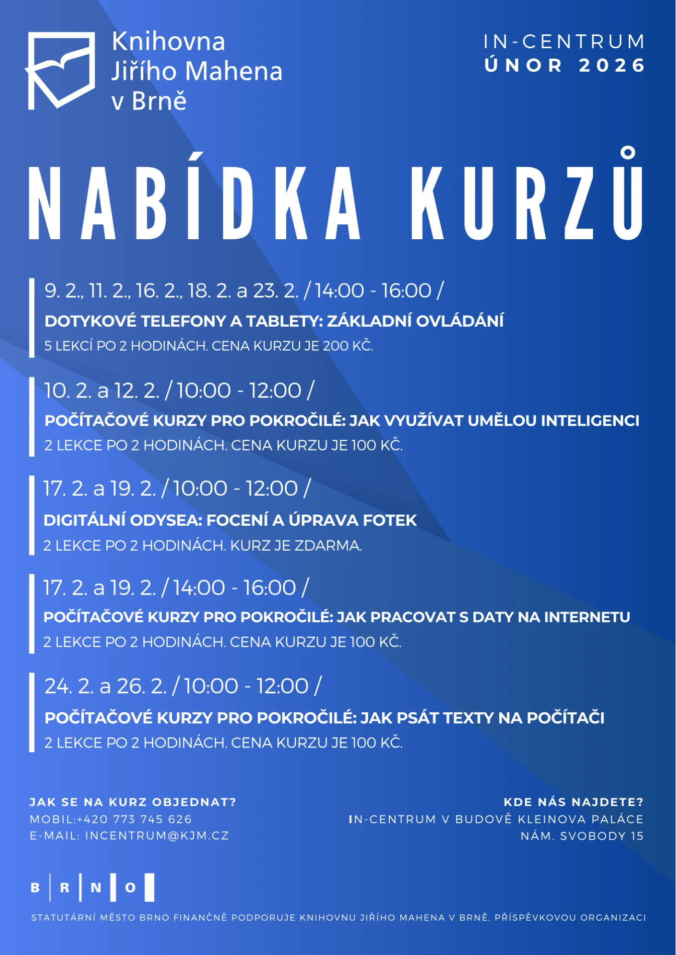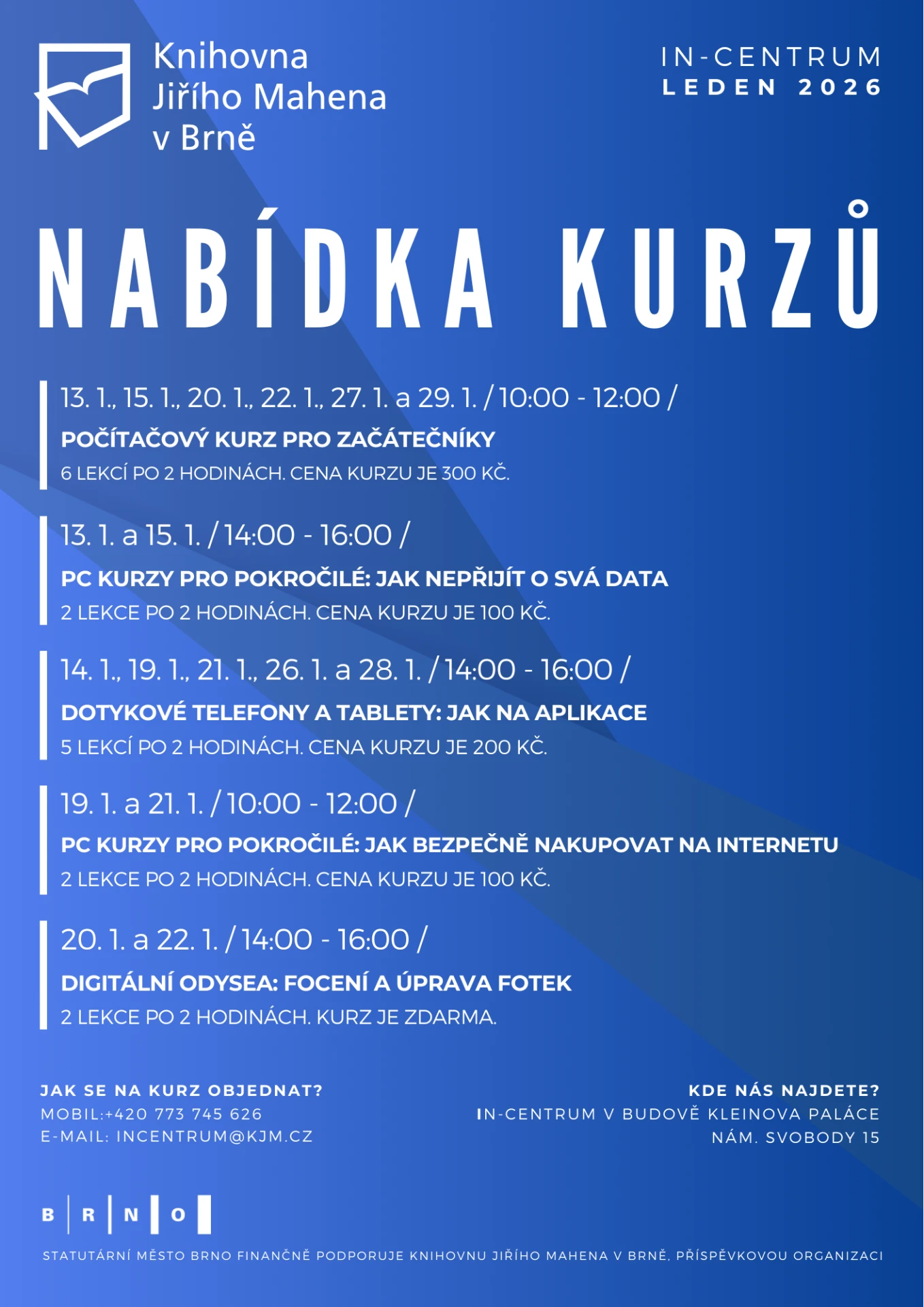 Na placené kurzy se můžete přihlásit telefonicky na čísle +420 773 745 626 nebo e-mailem na adrese incentrum@kjm.cz.