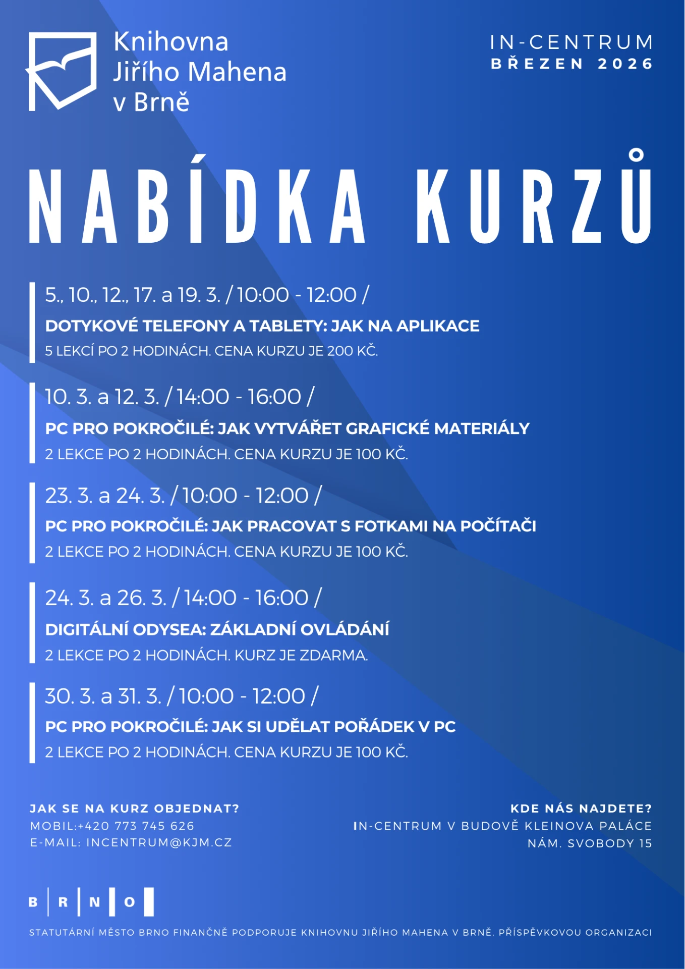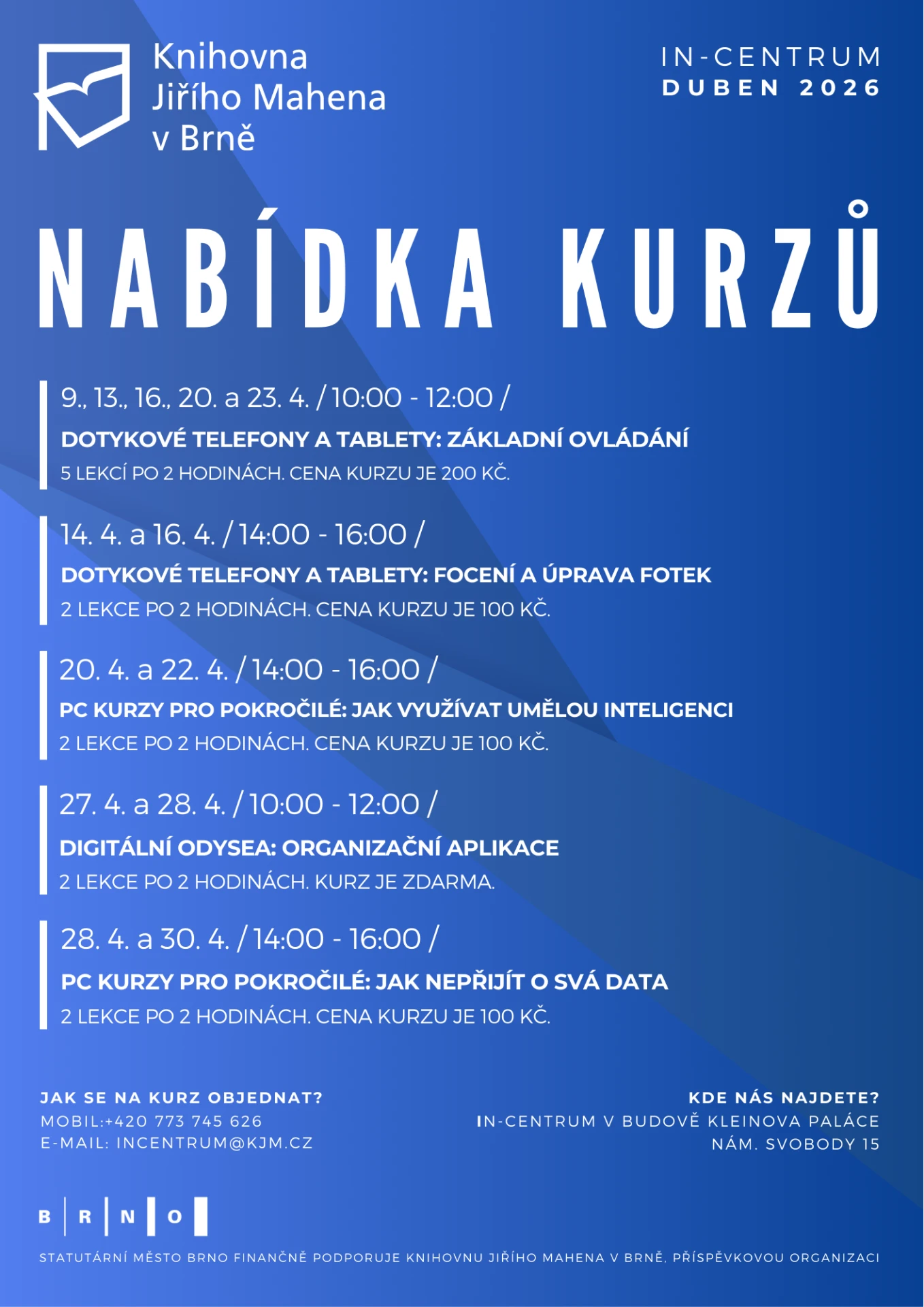 Na placené kurzy se můžete přihlásit telefonicky na čísle +420 773 745 626 nebo e-mailem na adrese incentrum@kjm.cz.